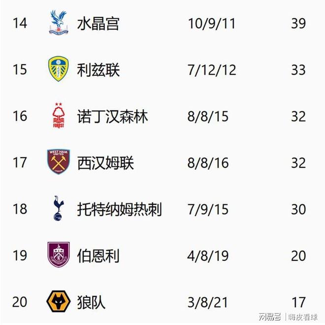 从最新的积分榜来看,英超只剩下最后7轮比赛,伯恩利和狼队分别只有20分和17分,狼队多赛一场,两队降级基本没有悬念。少赛一场的水晶宫有39分,排在第14名,从这里往上的所有球队,基本上没有降级的可能。